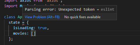 Class형 컴포넌트 안에 state 설정을 하는데 Parsing error: Unexpected token =eslint 라는 에러가 떴다.